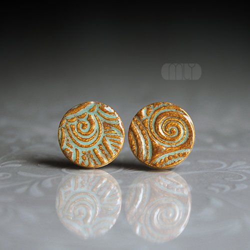 Ceramiczne okrągłe kolczyki w formie sztyftów, ręcznie wykonane z delikatnej jasnobeżowej gliny kamionkowej, dekorowane wgłębnym reliefem, szkliwione rudobrązowym i zielonym szkliwem, na sztyftach w kolorze srebrnym.Średnica ok. 11mm.. Polecam