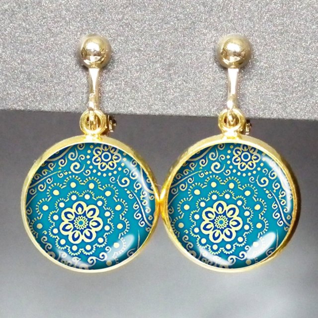 Eleganckie, małe wiszące klipsy z oryginalną grafiką artystyczną, zatopioną pod szkiełkiem, w oprawie w kolorze złota. Urocze, nieduże, delikatne klipsy. Hipoalergiczne.