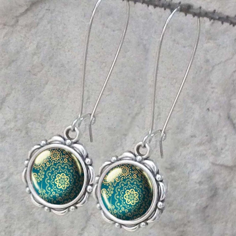 Kolczyki wiszące z oryginalną grafiką, zatopioną pod wypukłym szkiełkiem i oprawioną w bazę w kolorze antycznego,oksydowanego srebra. Grafika jest najwyższej jakości, wyraźna i nasycona. Bigle hipoalergiczne, zapinane posrebrzane. Oryginalne kaboszony- wykonane ręcznie według mojego projektu i przeze mnie, z dbałością o każdy detal. Biżuteria nie zawiera niklu i ołowiu.