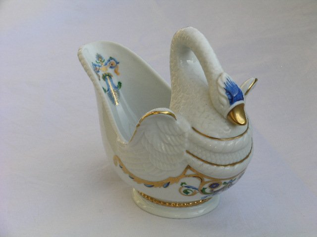 Wyjątkowa sosjerka w niezwykłej, łabędziej odsłonie. Kolekcjonerska seria Orient Express Elizabeth Arden; japońska, sygnowana; edycja z 1984 roku. Intrygujące połączenie ergonomii z odważnym polotem formy :) Fakturowość łabędziego upierzenia, błyszczące szkliwienie i złocenia. Ciekawe wzory. Jest coś imperialnego, carsko-egipskiego w tej estetyce...Fantastyczna, elegancka idealna na prezent i do lubego użytkowania ;)