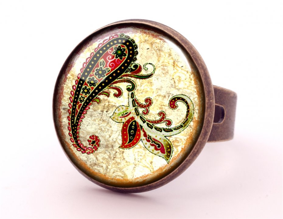 Ręcznie robiony regulowany pierścionek z wysokiej jakości grafiką pokrytą wypukłym, powiększającym szkiełkiem.