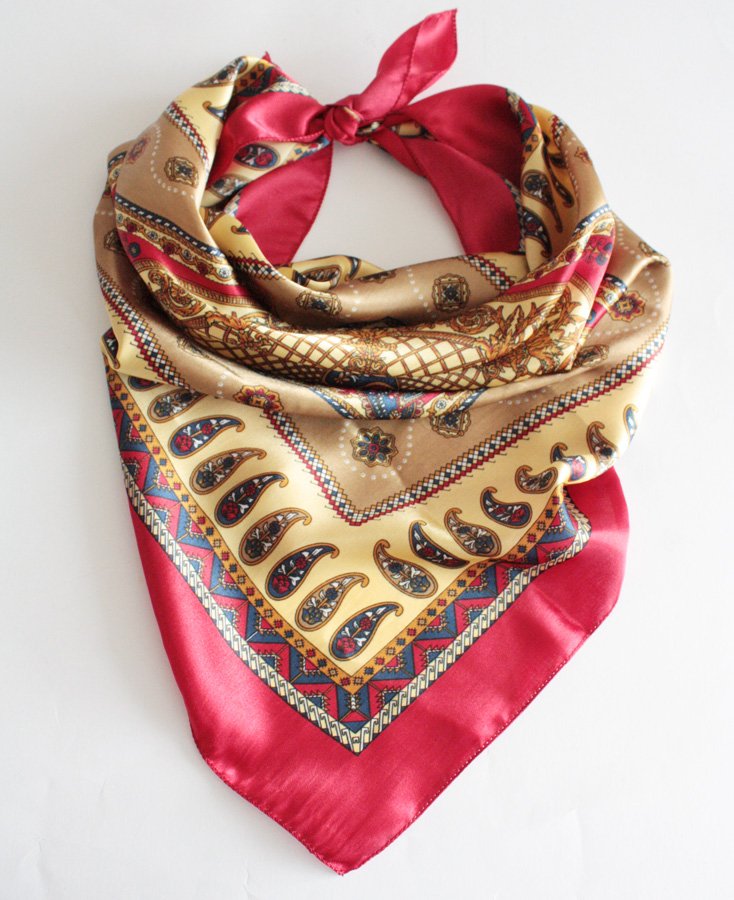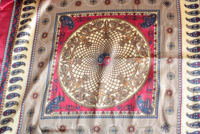 Zwiewna chusta w orientalne wzory z czerwoną ramką. Materiał ma delikatny, elegancki połysk.