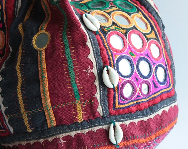Orientalna torba ozdobiona lusterkami, muszelkami i wyszywanymi elementami. Materiał to prawdopodobnie bawełna. Na górze torba ściągana jest na górze troczkiem, który można zawiązać.