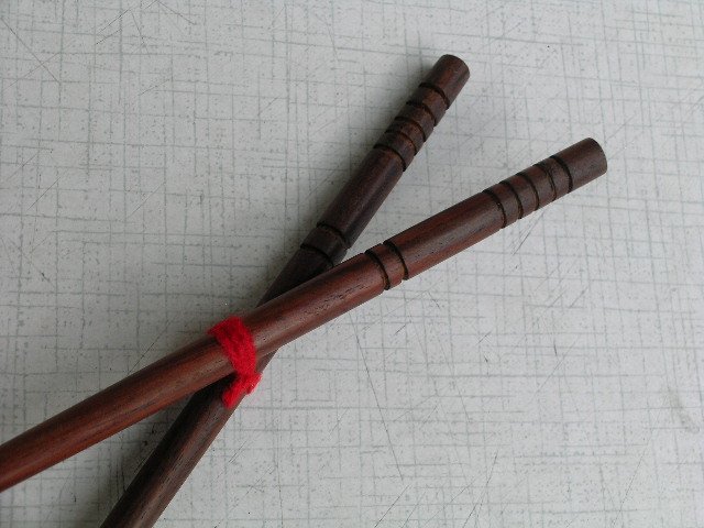 Pałeczki z drewna egzotycznego, subtelnie dekorowane. Klasyczna długość 25 cm. Matowe. Nowe, z oryginalnym związaniem włóczkowym.