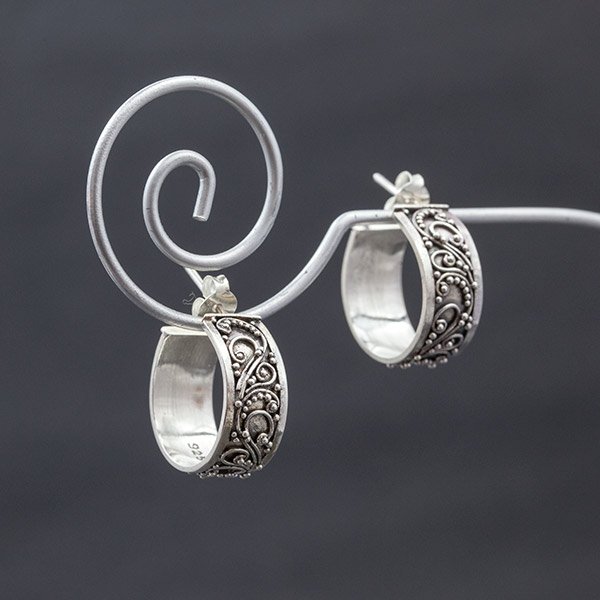 Kolczyki zdobione w stylu balijskim, w całości wykonane ręcznie ze srebra próby 925. Wielkość kolczyków 17 mm. Szerokość obręczy 7 mm. Kolczyki są ozdobnie zapakowane.