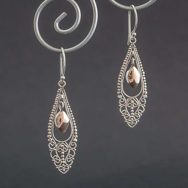 Kolczyki wykonane ze srebra próby 925 z elementami pokrytymi 18-karatowym złotem. Wielkość ażurowej tarczy 11x32mm. Długość kolczyków 4,7cm. Kolczyki są ozdobnie zapakowane.