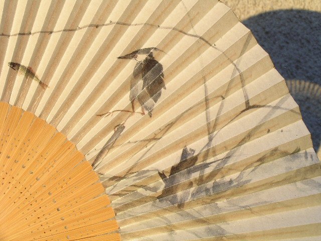 Lekki wachlarz wykonany z naturalnych materiałów - bambus i papier zdobiony ryciną, perłowym pobłyskiem lakierowany. Wyjątkowy, bo w stanie zachowania bardzo, bardzo dobrym. 22 x 2,5 cm. Niezbędny skarb na letnie upały :)