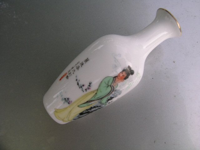 Niewielki Porcelanowy Wazonik. Cienka,prześwitująca porcelana. Sygnowany. Uroczo zdobiony. Z jednej strony wzór - druga strona biała gładka. Wzór nieco satnowy,reszta na błyszcząco wykończona. Rant złocony.