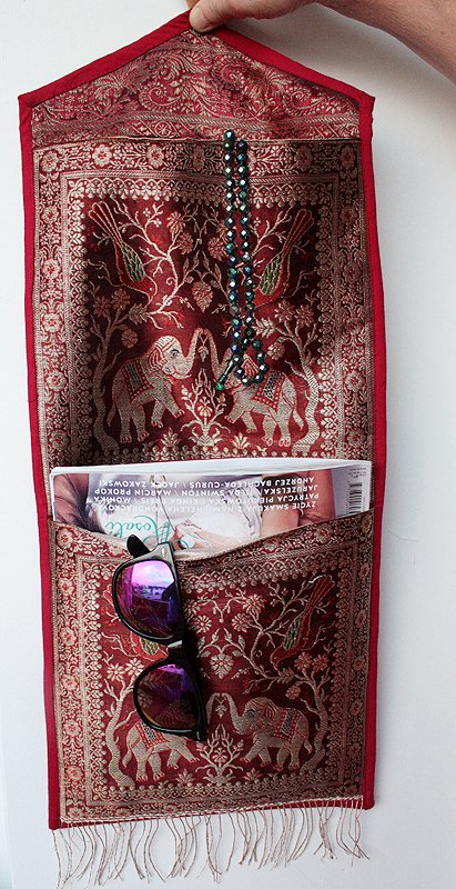 Przybornik w orientalnym stylu, tkany nitką w kolorze starego złota. Przybornik może mieć wielorakie przeznaczenie i wisieć w różnych pomieszeniach. Posiada dwie pojemne kieszenie i uchwyt do powieszenia.