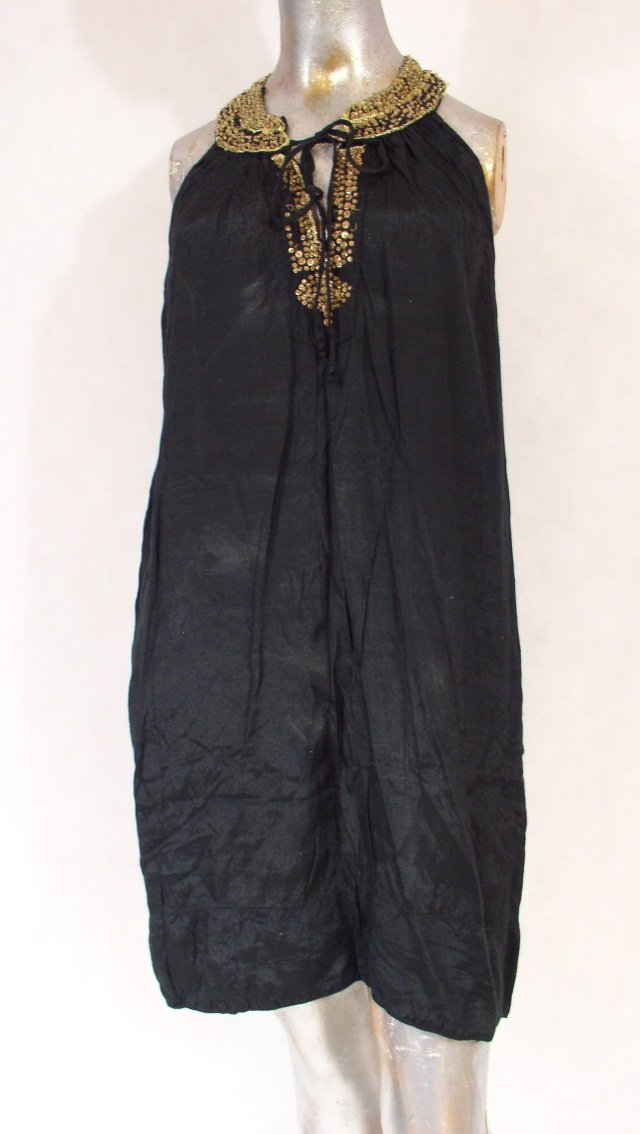 Sukienka firmy ORNAMENT.Rozmiar L.Materiał 100% rayon.Bez rękawów.Pachy wycięte w reglan,Cała góra marszczona do okrągłego karczka,wiązanego z przodu+rozcięcie.Karczek i rozcięcie ozdobione złotymi cekinami.Stan dobry,braki w cekinach.Długość 93 cm.pod pachami 130 cm.fason lużny.
