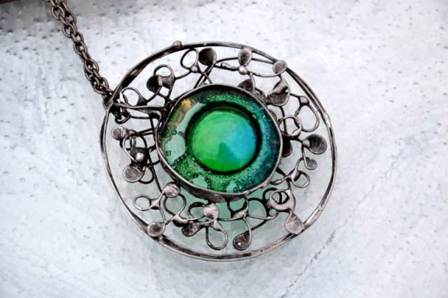 Niezwykły, tajemniczy retro wisior ze szkłem. Wisior o średnicy ok. 6 cm misternie oprawiony w cynę stylizowaną na stare srebro zawieszony na długim łańcuchu.