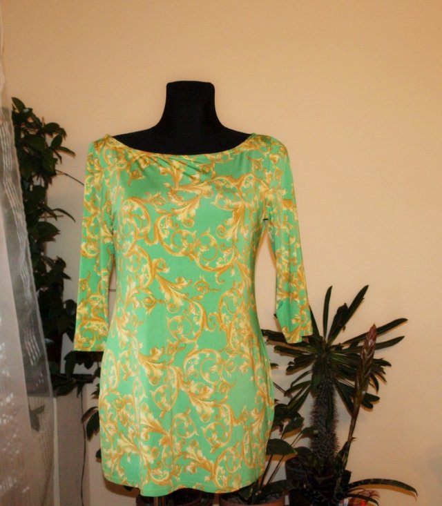 Zielona tunika marki floyd. Piękny zielony kolor ornamentowy wzór, rękaw 7/8. Materiał śliski, miły, lejący (brak metki). Stan bardzo dobry. na manekinie o rozmiarze 38. Podaję wymiary mierzone na płasko;