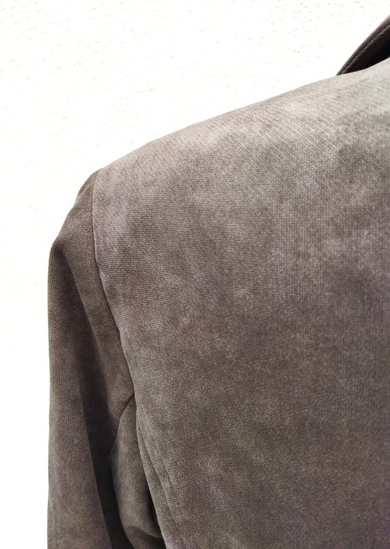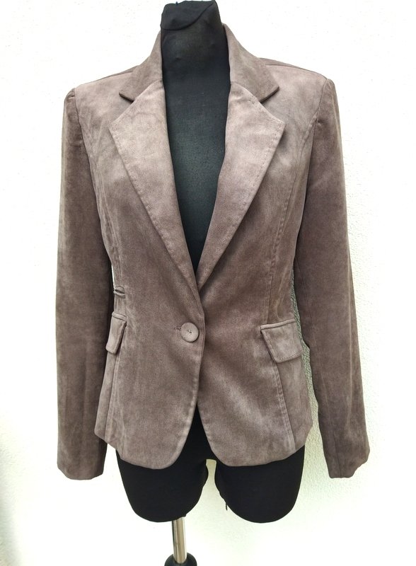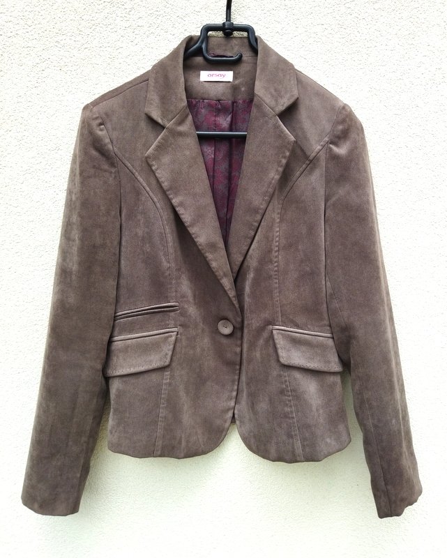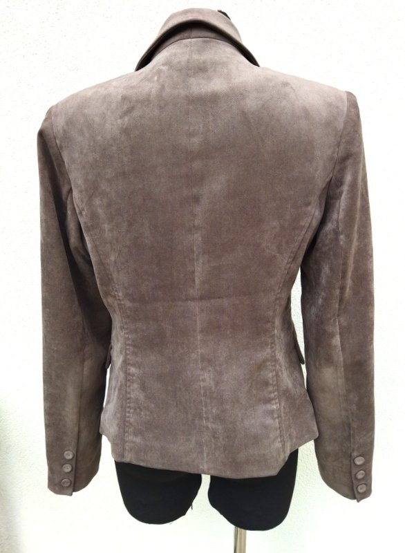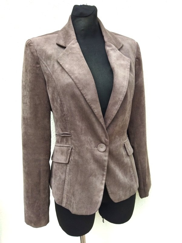 Zgrabna marynarka z miłej tkaniny imitującej zamsz w mysim kolorze Z kołnierzem z rewersami , z dwiema wpuszczanymi kieszeniami z patkami, zapinana na jeden oblekany tkanina guzik, 3 mniejsze na mankietach rękawów. Całość na eleganckiej wzorzystej podszewce