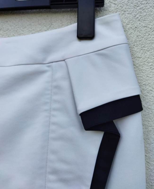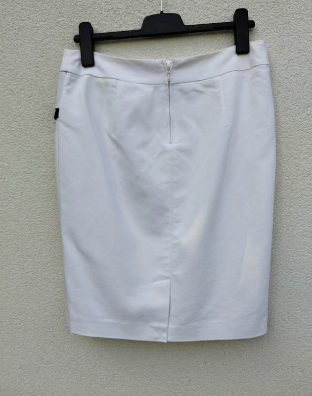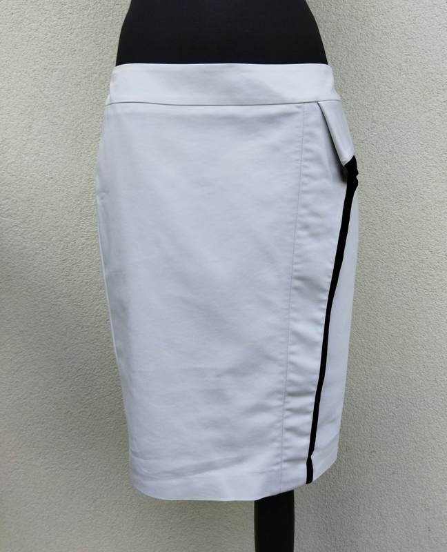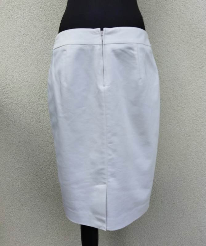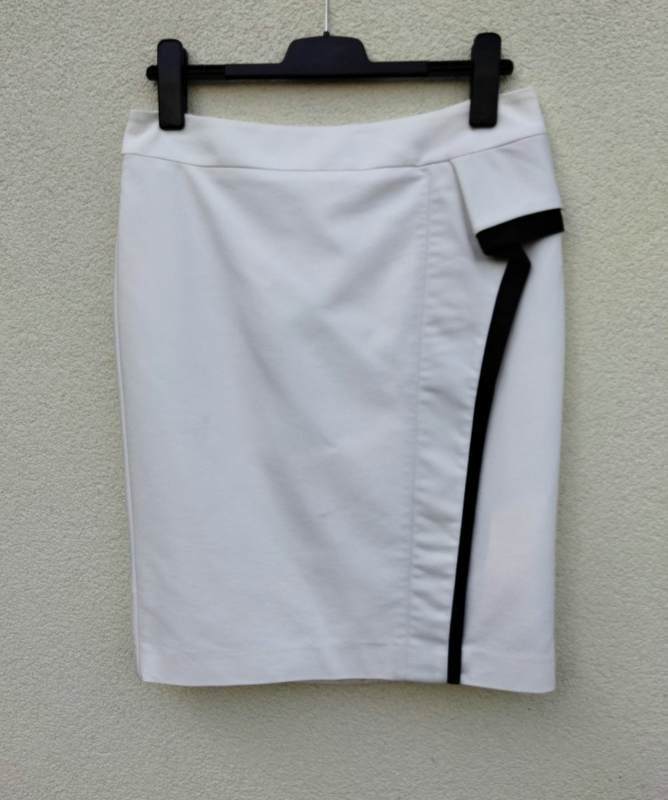 Zgrabna ołówkowa spódnica z bawełniano- poliestrowej tkaniny dobrze trzymającej fason , w kolorze mlecznej bieli. Z czarnymi elementami wykończeniowymi. Zapinana z tyłu na zamek, z krytym rozcięciem u dołu. Na podszewce