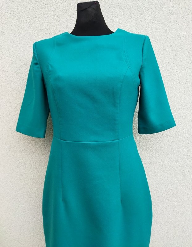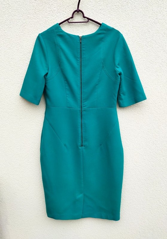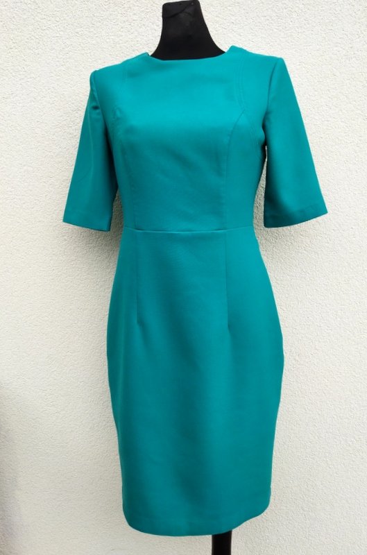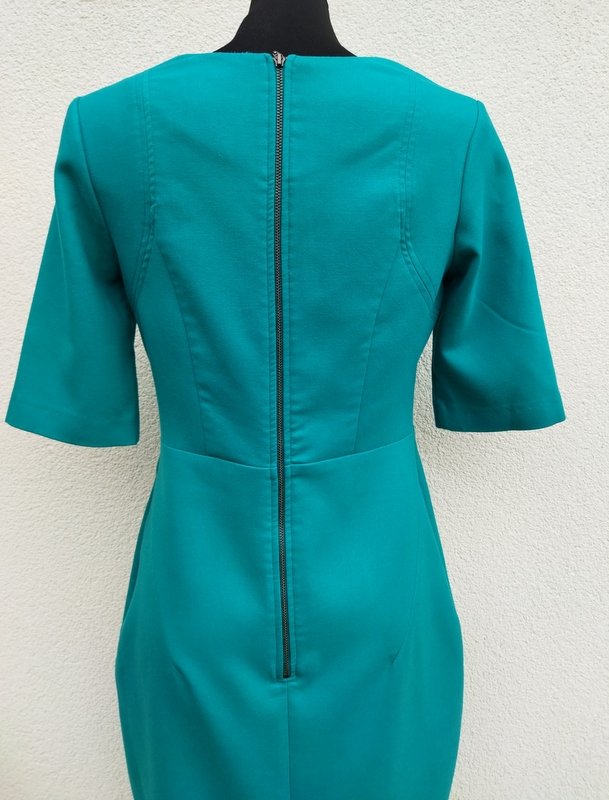 Zgrabna ołówkowa sukienka z poliestrowo-wiskozowej tkaniny w kolorze szmaragdowej zieleni. Starannie uszyta i wykończona. Zapinana z tyłu na długi zamek. Bez podszewki.