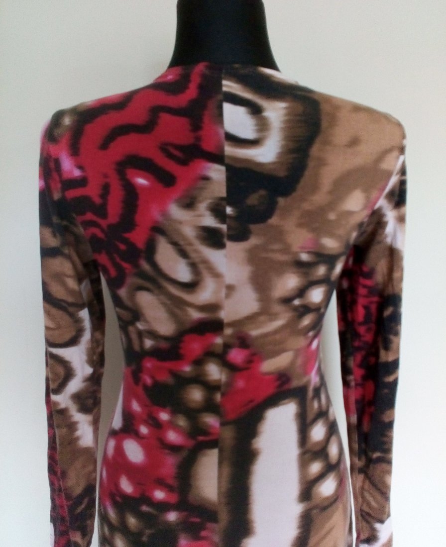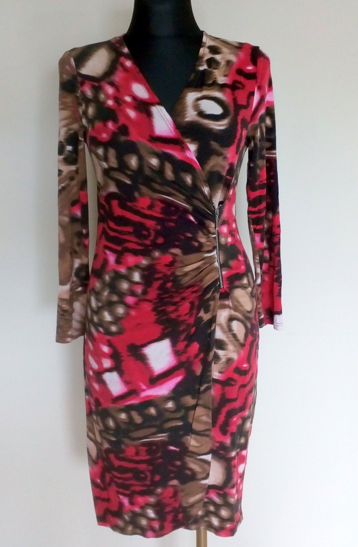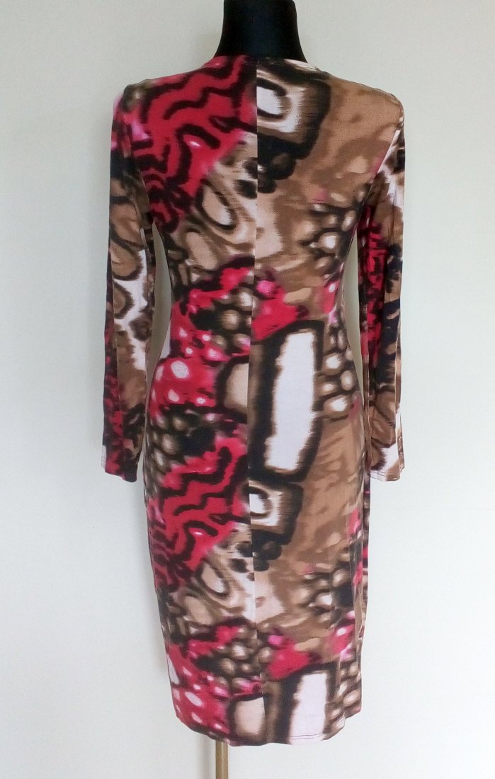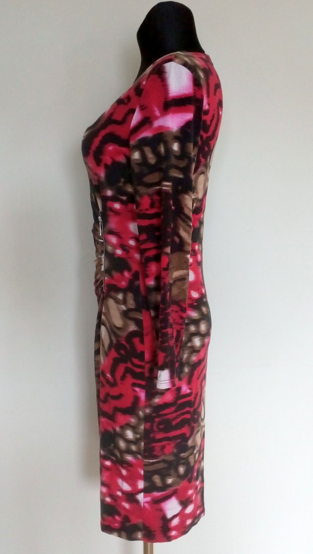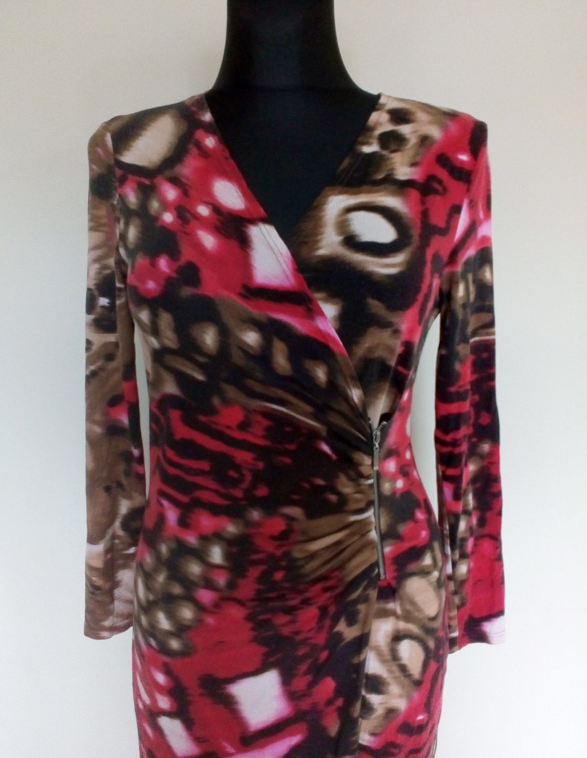 Sukienka z dzianiny jerseyowej, zakładana kopertowo, przód z podwójnej warstwy materiału, po boku przodu metalowy zamek, przy zamku sukienka drapowana, dół tulipanowy, zaokrąglony,