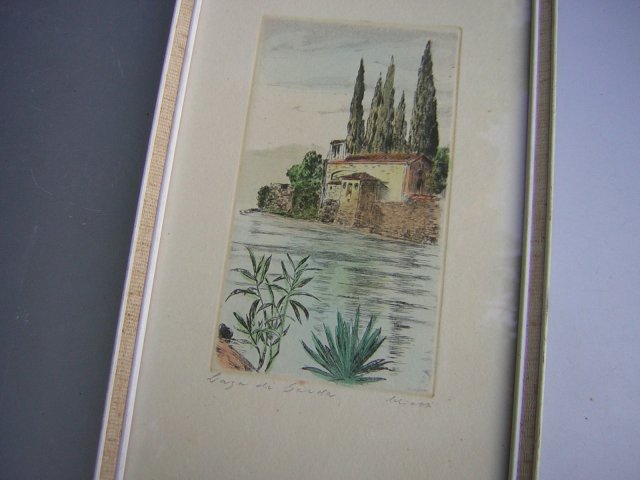 Oryginalna akwaforta,sygnowana LASA DI SARDA i niestety nie mogę się doczytać nazwiska autora. Charakterystyczne dla tej techniki wkleśnięcie powstałe przy odciskanie na papierze. Delikatne podmalowania kolorem. Precyzyjna kreska. Za szybką, w ramce delikatnej, acz szlachetnej. Wyglada na drewno malowane plus materiał lekko szorstko - fakturowy w naturalnym beżowym kolorze. Gotowe do powieszenia, choć nosi ślady czasu . Całość wygląda na dość starą rzecz.