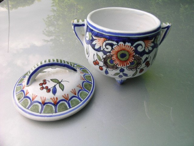 Pojemnik z Przykrywką. Uszka o ciekawym kształcie,trzy nóżki...wykończenie satynowo-błyszczące. Ręcznie malowany wzór podszkliwny w stonowanych,naturalnych barwach.