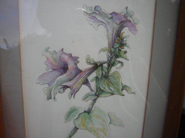 Obrazek precyzyjnie piórkiem i farbami wodnymi malowany.Petunie do roli królowej kwiatów wyniesione. Sygnowany A.H.P. PETUNIAS BY MR. A.H. PACKWOOD. Oprawiony w drewnianą Ramkę i dobrane kolorem do obrazka passpartou. Starej daty, wskazuje na to delikatne przyżółcenie papieru na rantach zewnętrznych papieru przy passpartou i samego passpartou. Ramka z szybką tez nosi ślady czasu. Na obrazku maleńka plamka widoczna na zdjęciach.