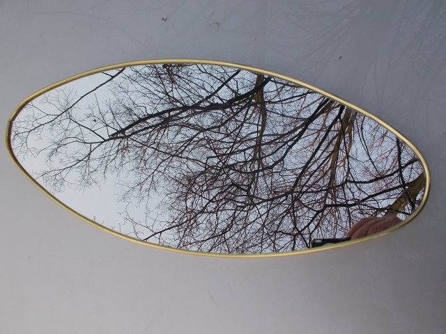 Oryginalne lustro z lat 60-ych. Do powieszenia w pionie z charakterystyczną dla tamtych lat metalową taśmą dookoła; Taśma lekko złota z czarnym paskiem /na ostatnim zdjeciu widać jej jedyna wadę - zachlapanie farba - na pewno do usunięcia. Lustro w dobrym stanie,choć znaki czasu na obrzeżu - dół i góra niewielkie,ale są - to ostatnio modne ...no i oryginał to oryginał. Z tyłu drewno i uchwyt do powieszenia. Gotowe do powieszenia we wnętrzu Vintage :) Fantastycznie prosty Design :) No i już rzadko spotykany.