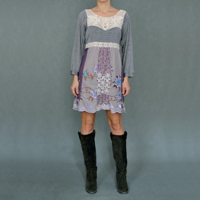Urocza sukienka- tunika w oryginalne wzory. Góra w drobne paseczki, dół w kwiatki. Przy dekolcie koroneczka. Góra jest elastyczna, natomiast dół z koszulowej bawełny. Z boku zameczek. Polecam.