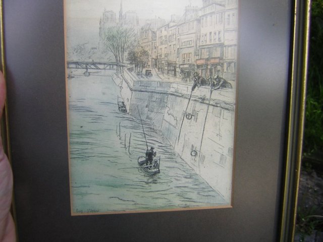 Oryginalna AKWAFORTA z limitowanej edycji . "Quey Of Paris" Stareńka to rzecz - autor EUGENE VEDER - francuski malarz i grafik 1876 - 1936. Fantastyczna praca, oprawiona w drewnianą ramkę w kolorze złota i zielonej patyny. Passpartou dobrze dobrane do Akwaforty i ramy. Rama z nalepką od spodu The Gloucester Picture Frame Centre / plus adres/ . Szyba antyrefleksyjna.Akwaforta bardzo piękna, dopracowana, czerń piórka i delikatne podmalowania w zieleni, pomarańczu i żółci. . Podpis autora. Wartościowa to sztuka ;)