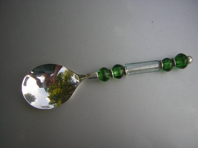 Bardzo ciekawa i nie spotykana, duźa, ciężka. ..łyżka do sałatek. Metal i recznie formowane szklane koraliki. Całość na metalowej sztycy przedzielona metalowymi obejmami. Na końcu metalowa kulka - nakrętka. Poręczna, światlolubna, oryginalna.