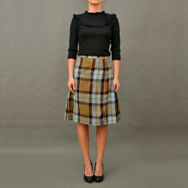 Oryginalna szkocka spódnica. Zakładana portfelowo -zapinana w pasie na guziczki. Z przodu gładka, z tyłu plisowana. Ponieważ jest portfelowa, guziczki można przeszyć nawet o kilka centymetrów. Na tą chwilę w pasie są naszyte na rozmiar M. Fajny dobór kolorystyczny - błękit i oliwka z dodatkiem czerni i czerwieni.
