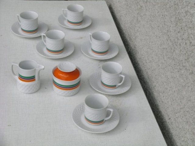 Wyjątkowej urody zestaw herbaciano-kawowy, sygnowany Schirnding Bavaria. Wysokiej jakości szlachetnie prześwitująca i mile dźwięcząca biała porcelana, wzorem wklęsło-wypukłym ryflowana, pasami apetycznych barw graficznie zdobiona. Klasyczne wzornictwo lat 70-tych, odważnie łączące klasykę z geometrycznością.
