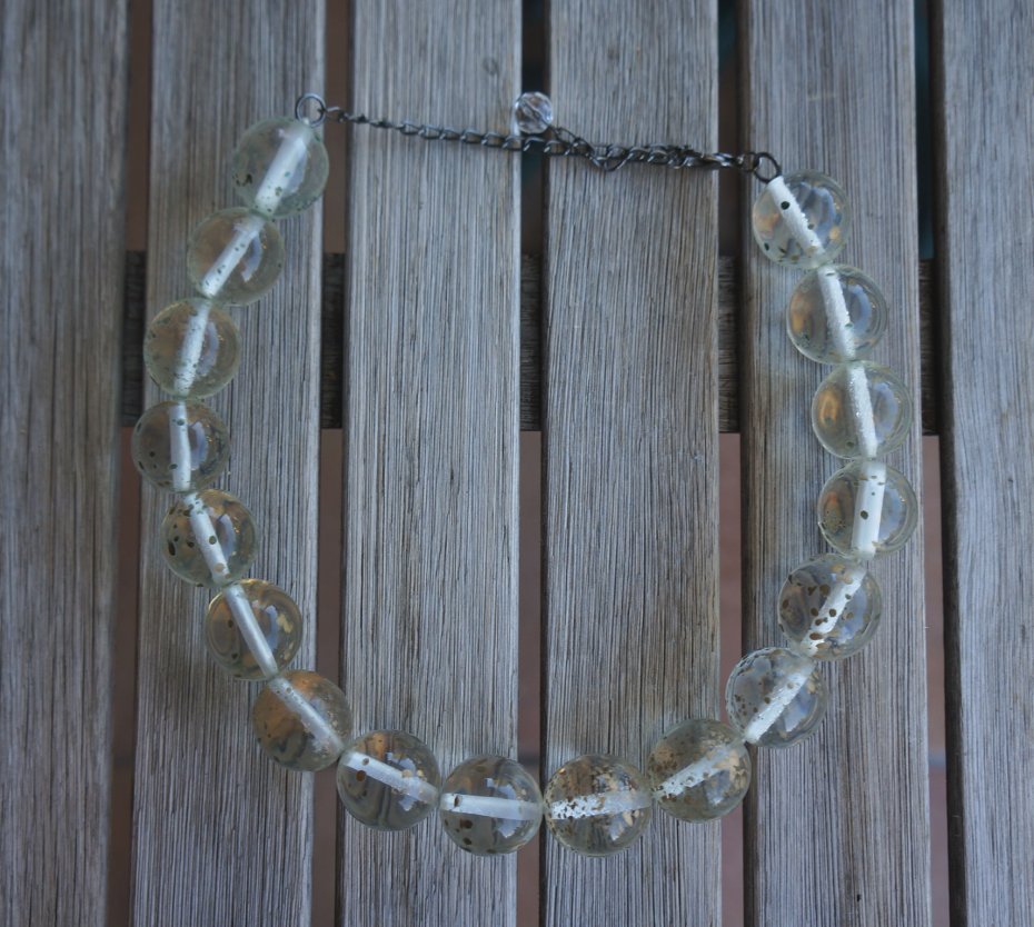 Bardzo elegancki i efektowny naszyjnik. Kule wykonane z przezroczystego tworzywa, w który zatopiony jest złoty brokat. Możliwość regulowania długości.