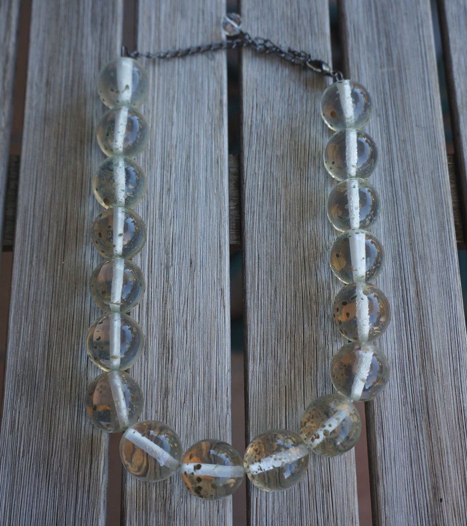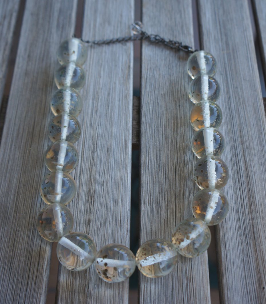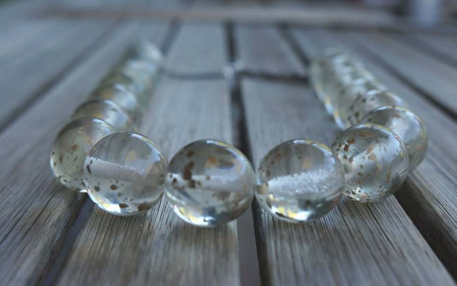 Bardzo elegancki i efektowny naszyjnik. Kule wykonane z przezroczystego tworzywa, w który zatopiony jest złoty brokat. Możliwość regulowania długości.