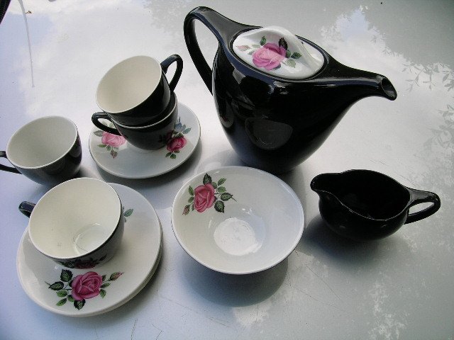 Oryginalny Zestaw z lat 50-ych,produkcji angielskiej.Sygnowany BRISTOL Founded in 1652 England.Dzbanek,cukiernica - miseczka mlecznik,pięć filiżanek i sześć talerzyków. Ciekawe organiczne kształty charakterystyczne dla lat 50/60. Ciekakawe zdobienie - soczyste w kolorach róże - kontrastujące z oszczędnym błyszcząco wykończeniem w kolorze czerni i ciepłej bieli. Bardzo ciekawe i kobiece. Nowoczesne i dziś.