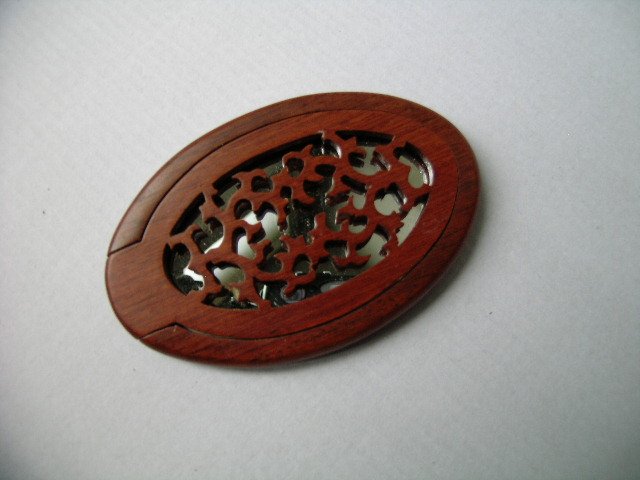 Wielce ciekawe Lustereczko podręczne z egzotycznego drewna z orientalnym ażurowym wzorkiem. Lekkie,poręczne...rozkładane; Klapka ze wzorkiem po otwarciu jest podstawką. Ciekawa konstrukcja,dobre wykonanie; Oryginalna to rzecz i bardzo ładna :)