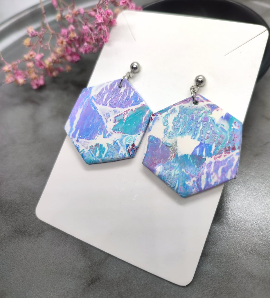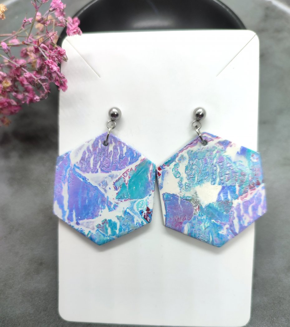 Lekkie i abstrakcyjne kolczyki wykonane z glinki polimerowej o długości ok. 3,5 cm, szerokości ok. 3 cm. Wkręty/sztyfty wykonane z stali nierdzewnej w kolorze srebrnym. Kolorystyka wielobarwna z przewagą koloru niebieskiego,fioletowego i różowego.