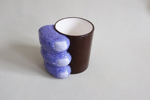 Z boku bardzo ciekawe ucho w postaci dużej łapy- można włożyć własne palce i trzymać kubek.