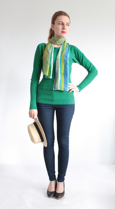 Zielony sweterek o oryginalnym fasonie. Dopasowuje się do sylwetki.