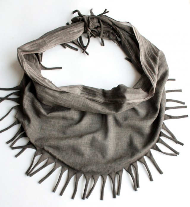 Chusta o niezwykle oryginalnym fasonie w niejednolitym odcieniu szarości z kroplą brązu. Chusta ładnie się układa, świetnie sprawdzi się zamiast biżuterii. Produkt unisex. Chusta jest trójkątna, z zaokrąglonym rogiem. Materiał to delikatna bawełna, zaś frędzle wykonano z dzianiny typu T-shirt.