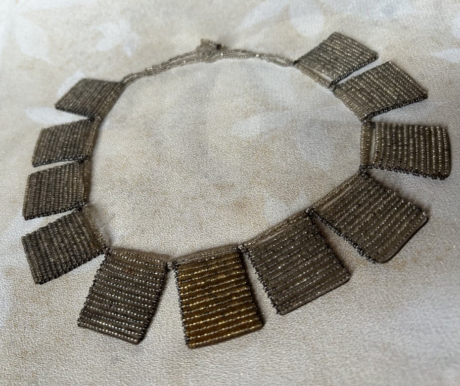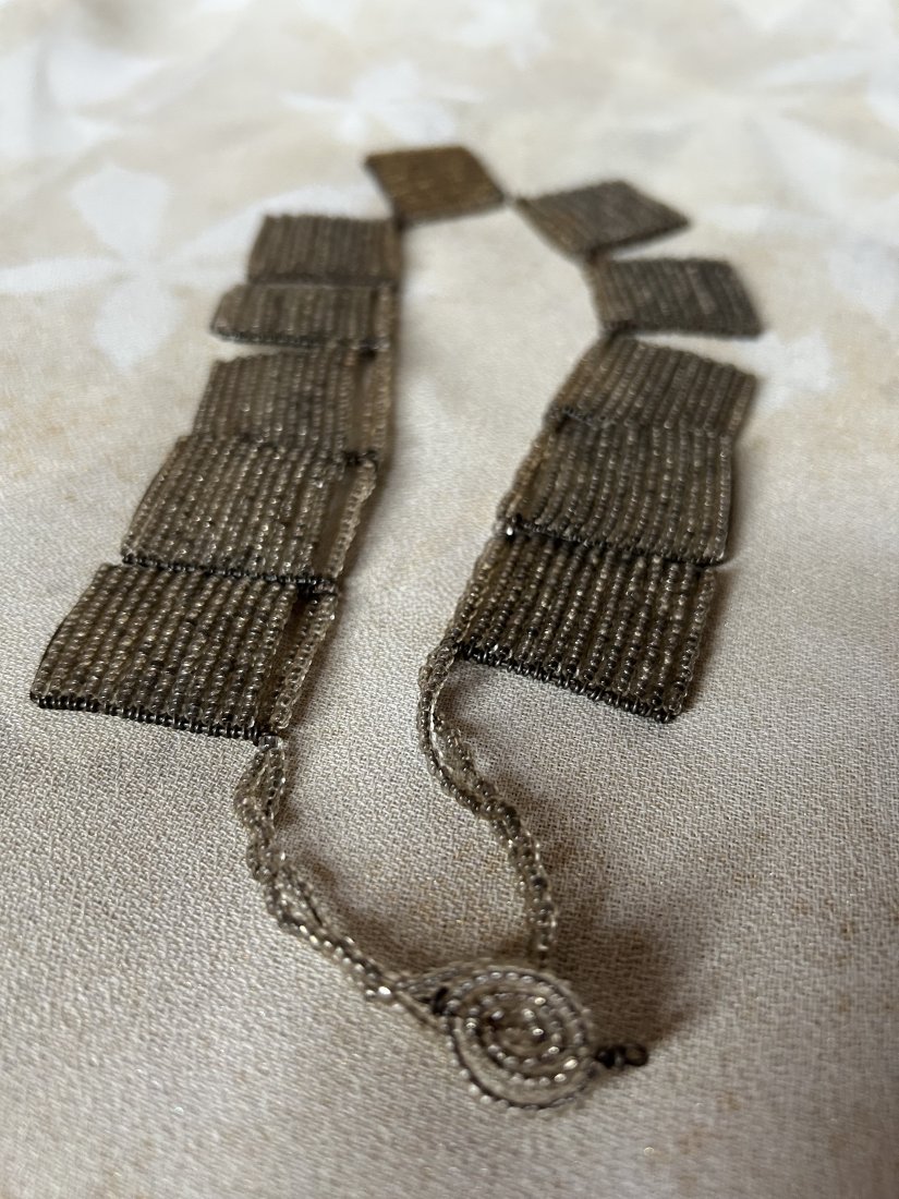 Hand made by Africa - przywieziony z Afryki koralikowy , oryginalny naszyjnik - afrykańskie rękodzieło . Szaro srebrno złote koraliki precyzyjnie na druciki nanizane . Długość całkowita 42 11 prostokątów około 3 x 3,5 cm koralikowe zapięcie . Stan zachowania bardzo dobry - minimalne ślady czasu i drobne wady ręcznego wykonania .