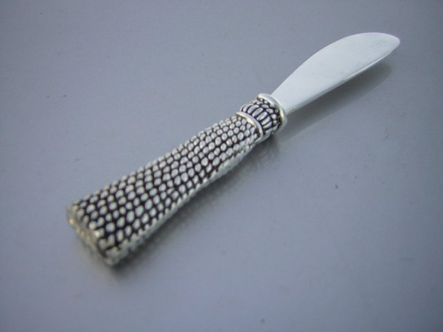 Metalowy, oryginalnie wykonany nożyk do masła. Bez sygnatury. Ciekawa, inna, fakturowa rączka. Elegancki, efektowny, użytkowy. 12,5 x 1,5 x około 1 cm rączka 6 cm x 1,5 x 1 szer ostrza 1,5 cm