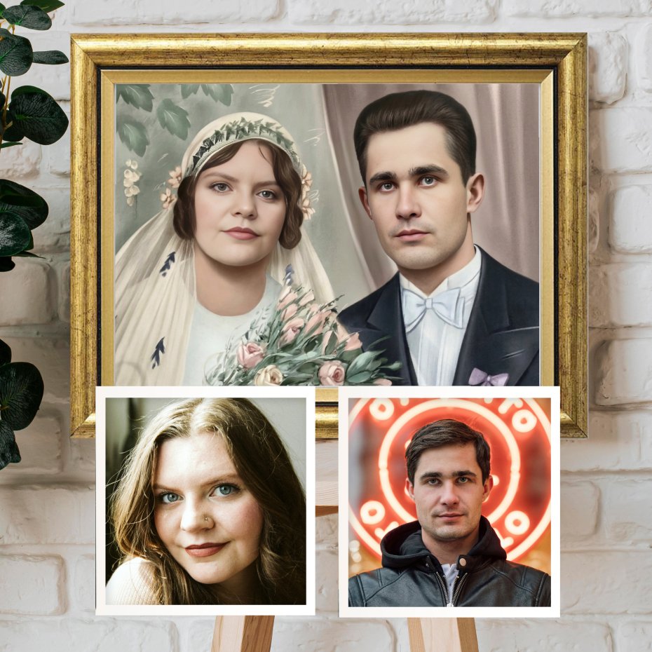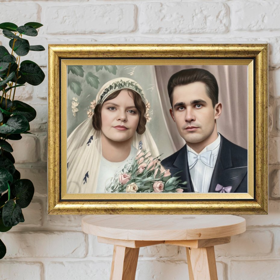 Podaruj personalizowany portret ślubny inspirowany pamiątkami z domów naszych dziadków – unikatowe monidło, które wzruszy, rozbawi i zostanie z obdarowanymi na długie lata.