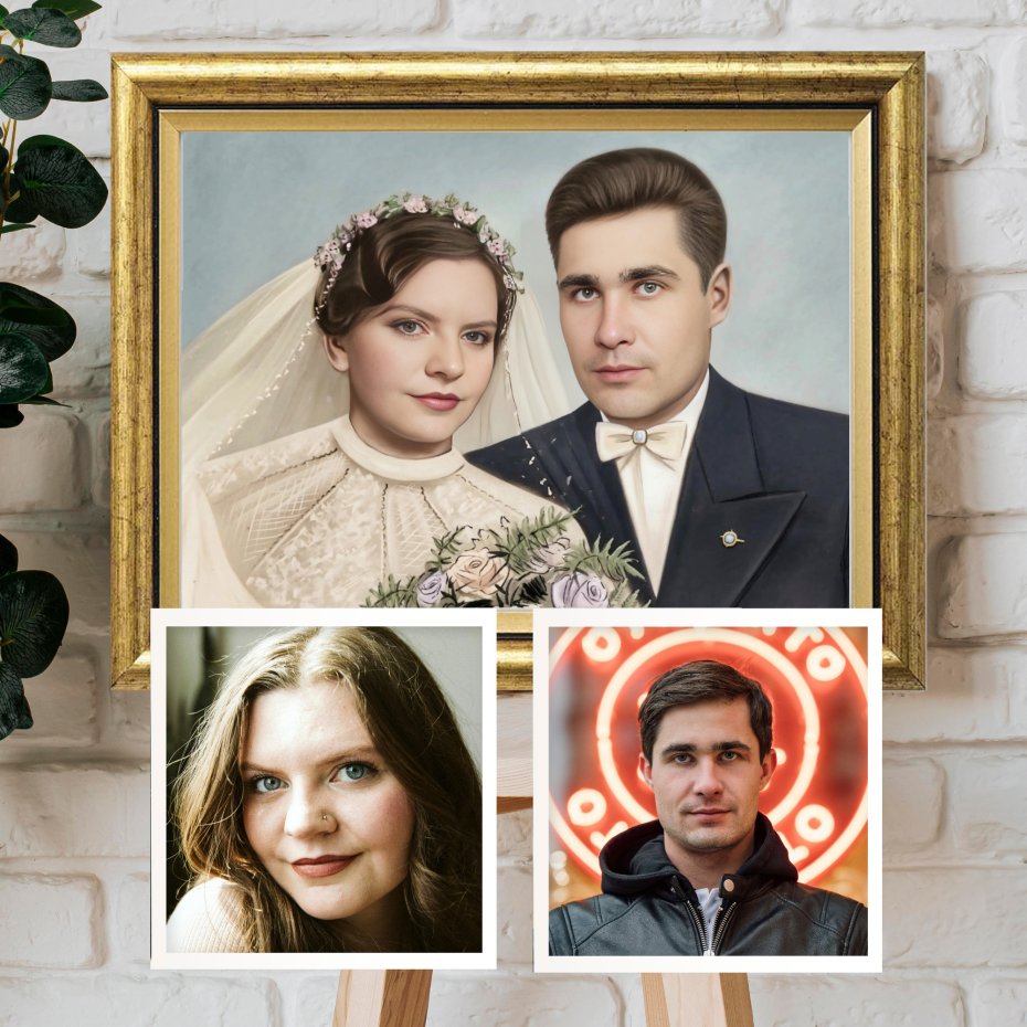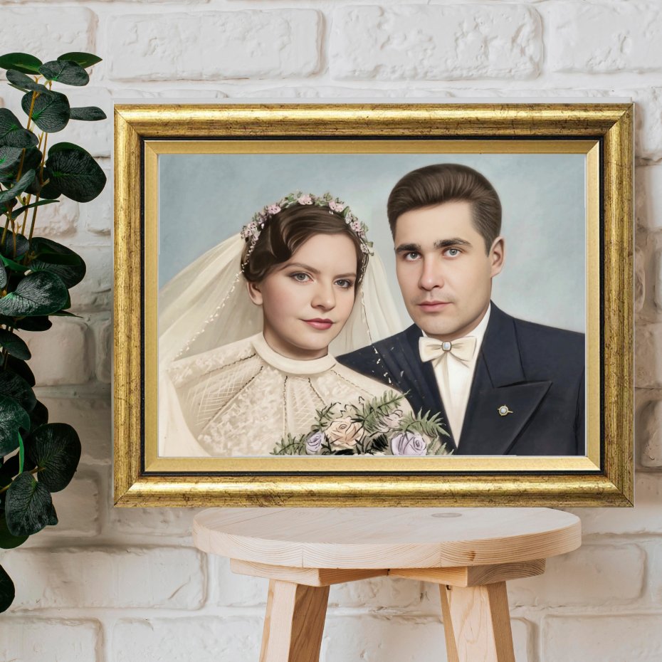Podaruj personalizowany portret ślubny inspirowany pamiątkami z domów naszych dziadków – unikatowe monidło, które wzruszy, rozbawi i zostanie z obdarowanymi na długie lata.