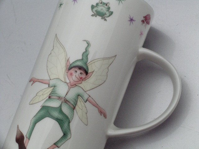 Uroczy wzór Elfi,żabi,gwiazdeczkowy,muchomorkowy....na szlachetnej białej porcelanie na błyszcząco wykończonej. Delikatne kolory wzóru i szczupła,wysmukła forma; Wygodne ucho. Cudo :)