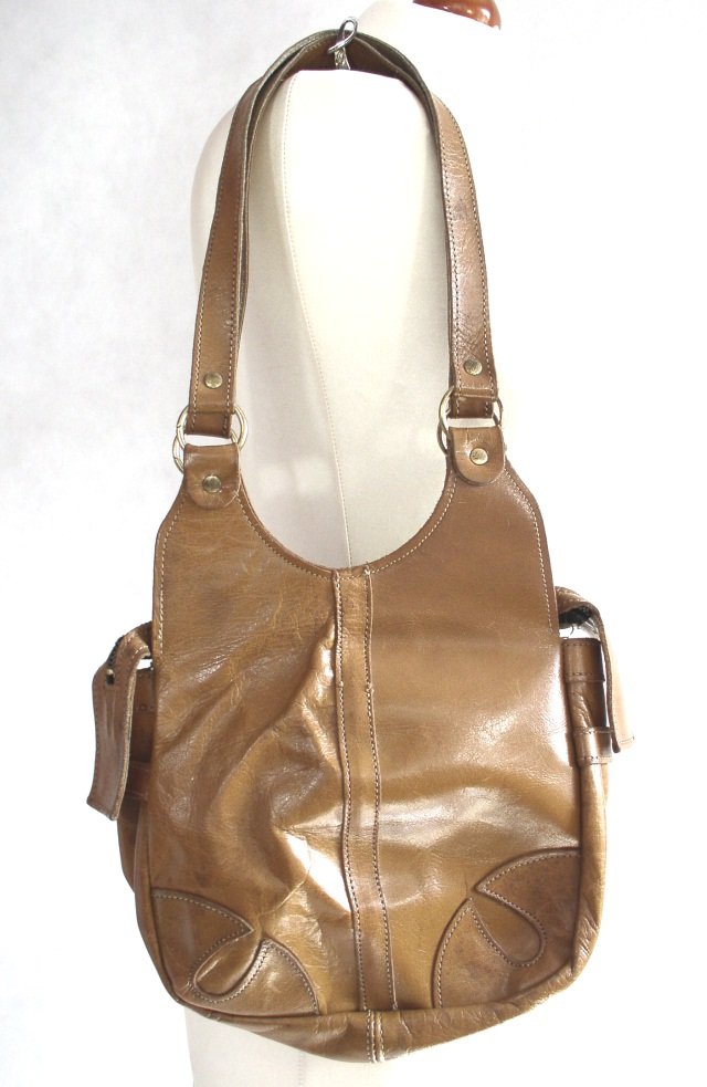 Mała torebka uszyta ze skóry naturalnej.Dwie rączki do noszenia w ręku lub na ramieniu.Przód ozdobiony naszywka ze skóry.Zapinana na zamek.Stan dostateczny,zamek do wymiany,wyrwany jeden ząbek.Wysokość na środku 21 cm.szerokość 21 cm.W środku jedna komora.Bez podszewki.