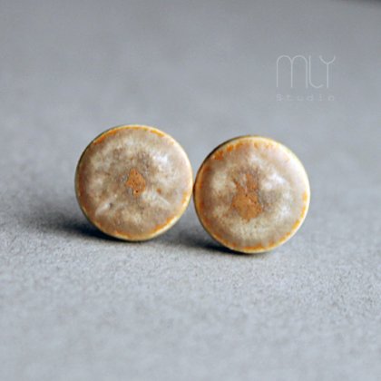Ceramiczne, lekko nieregularne kolczyki w formie sztyftów, ręcznie wykonane z delikatnej gliny kamionkowej, jednostronnie szkliwione efektownym beżowobrązowym szkliwem z efektem plamek, na antyalergicznych sztyftach w kolorze srebrnym.Średnica ok. 11mm. Polecam