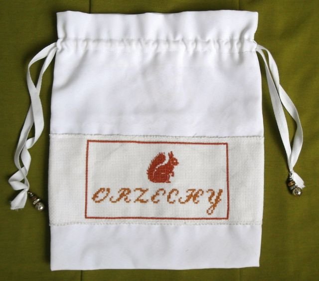 biały woreczek na orzechy, ozdobiony haftem z wiewiórką.Troczki zakończone koralikami.