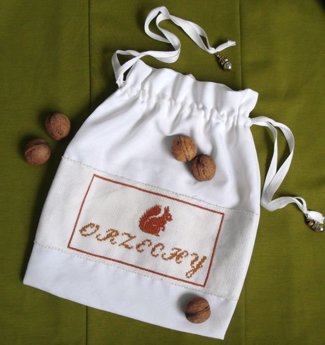biały woreczek na orzechy, ozdobiony haftem z wiewiórką.Troczki zakończone koralikami.