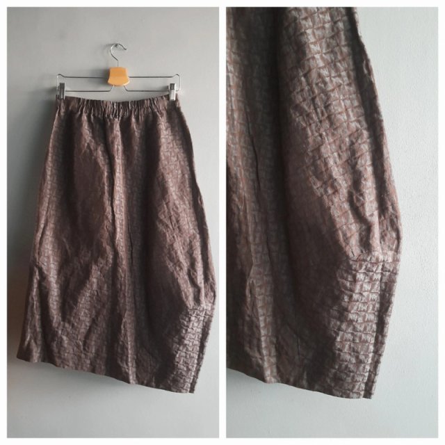 Świetny, lekko fakturowy materiał, piękny zestaw kolorystyczny brązu i szarości, ciekawy fason, lekka bombka asymetryczna symetrycznie, czyli jeden bok dłuższy drugi krótszy z rozcięciem , po bokach kieszenie, zapinana na zamek, z podszewką, doskonały jakościowo skład - ciekawy wełna z dodatkiem poliestru, optycznie jak tafta z wełną, piękna w bardzo dobrym stanie, długość! 90/80, pas 36/38 x2, z tyłu gumką, biodra ok 53x2 max