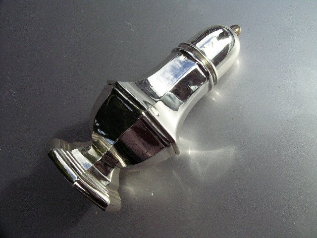Bardzo ciekawa metalowa na błyszcząco wykończona solniczka - pieprzniczka. Bardzo elegancka. Wewnątrz plasticzana od spodu wklejone zielone sukno. Nie sygnowana,ale bardzo szlachetnie wykonana. Odkręcana nakrętka ułatwia dosypywanie...Użytkowa z Klasą.
