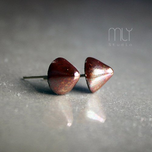 Ceramiczne kolczyki w formie sztyftów, ręcznie wykonane z delikatnej gliny kamionkowej, szkliwione mieszanką metalicznego złotobrązowego szkliwa, na antyalergicznych sztyftach w kolorze srebrnym. Średnica ok. 11mm.Polecam