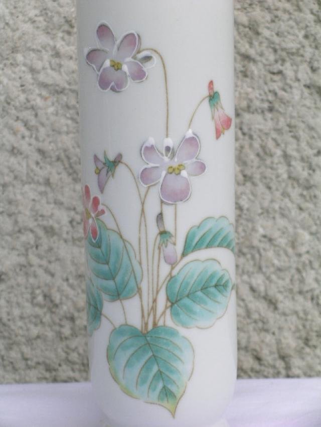 Porcelanowy wazon w ładnym prostym kształcie, sygnowany, japoński. Seria fiołkowa. Ręczne bielą podmalowanie, lekko fakturowe. Błyszczące szkliwienie. 4,5-5,5 x 17 cm. Stan zachowania bardzo dobry.
